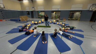 Länger als gedacht zog sich die Neugestaltung des Schulhofes an der Grundschule hin. Die Schüler nutzten die Sporthalle für die großen Pausenzeiten, sodass wir diese nicht nutzen konnten. Am 04.12.2025 war es dann endlich so weit – wir durften endlich mit dem 6-er-Club zum Sport in die Halle. Die Turnmatten wurden zu einem Kreis zusammengelegt und Nadine bot den Kindern verschiedene Entspannungsübungen an. Konzentriert arbeiteten die Kinder mit und hatten viel Spaß an den Übungen.